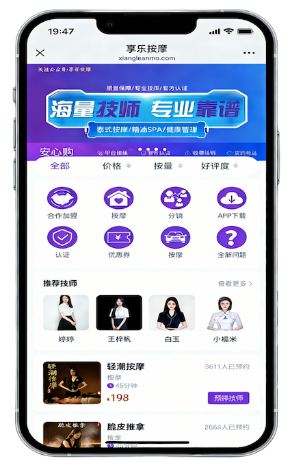“享乐上门按摩”是百营(北京)科技有限公司历时三年自主研发的一款同城上门按摩服务平台,软件于2020年正是上线,总部位于北京,是中国领先的互联网+上门健康服务品牌。依托数字化技术与专业健康管理理念,公司致力于为个人、家庭及企业客户提供安全、便捷、高品质的上门按摩及健康解决方案。截至2024年,服务已覆盖全国50+城市,拥有2000+认证技师,累计服务超300万人次。